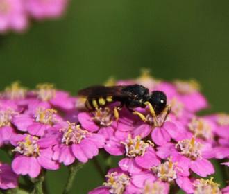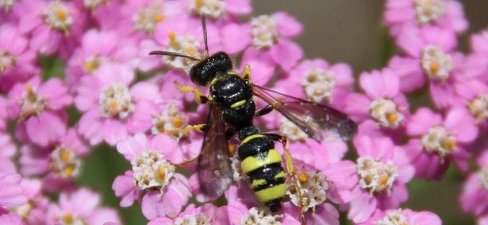 Couvre-sol un peu envahissant au jardin, l’Achillée est réputée attirer les butineurs, en particulier abeilles et papillons. Mais pas que. Allez savoir pourquoi, Achillée et guêpes solitaires font aussi très bon ménage. Tous genres confondus.
