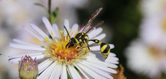 On a déjà rencontré ici plusieurs de ses cousins familiers du jardin. Du petit Eumène pomiformis à l’impressionnant Eumène unguiculé. Dans une taille intermédiaire, actuellement sur le massif d’asters, la Guêpe potière méditerranéenne (Eumenes mediterraneus) adopte bien sûr l’élégante silhouette jaune et noire caractéristique du genre.