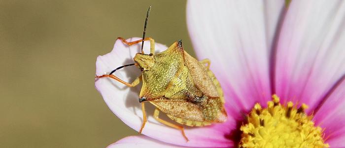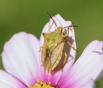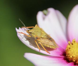 Rien d’étonnant à rencontrer le Pentatome méridional (Carpocoris mediterraneus) sur les cosmos du jardin. Comme la plupart des punaises, il ne dédaigne pas le pollen. Mais sa véritable gourmandise, ce sont les graines en formation. Tendres et juteuses. Il les transperce de son rostre et les siphonne avec délectation.