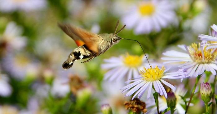 Au printemps, ce spécialiste du ravitaillement en vol participe activement à la pollinisation des arbres fruitiers. On le voit notamment dès le mois de mars sur le mirabellier en fleurs. La très longue trompe du Moro-sphinx (Macroglossum stellatarum), alias le Papillon colibri, fait également merveille dans les haies, pour visiter le profond tube nectarifère du Chèvrefeuille.