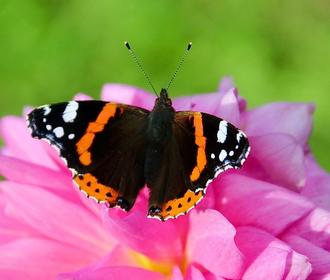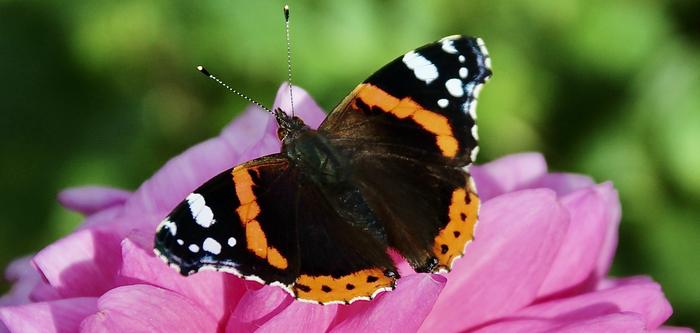 Allez savoir pourquoi, le grand papillon sombre à la flamboyante couronne rouge-orangé semble avoir élu domicile dans ce coin du jardin. Avec une préférence pour les foisonnantes coroles roses. De là, il prend longuement le soleil et observe son " territoire “ . Pour mieux pourchasser les importuns. Et toujours il revient se poster sur un de ses lumineux trônes.