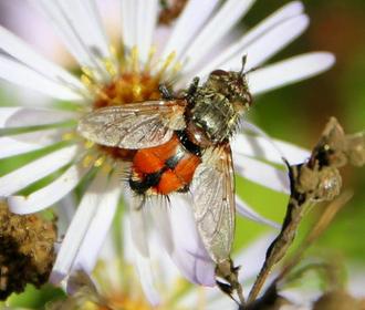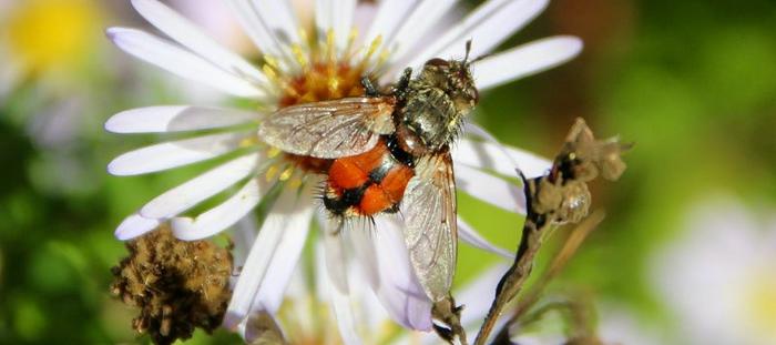 Encore une mouche qui avait passé son tour dans la touffeur de l’été ! La Phasie crassipenne (Ectophasia crassipennis) tente de rattraper le temps perdu en ce début d’automne. Malgré sa petite taille, moins de 1 cm, on la voit actuellement partout, au jardin comme dans les prairies alentour.
