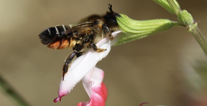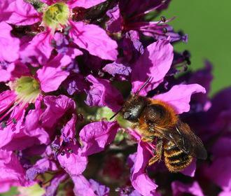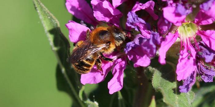On aimerait voir ça ! En attendant, thorax brun-rouge, court abdomen rythmé de fines bandes claires, brosse ventrale de collecte rouge : voici Madame Osmie hélicicole affairée sur un épi de Salicaire. La coquille ne doit pas être très loin !