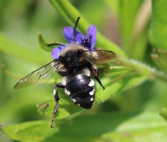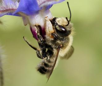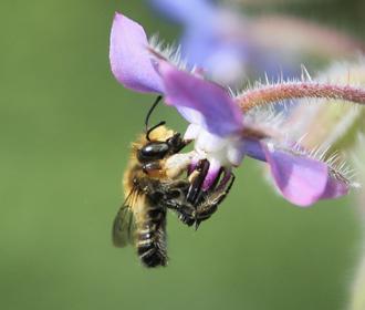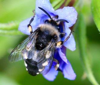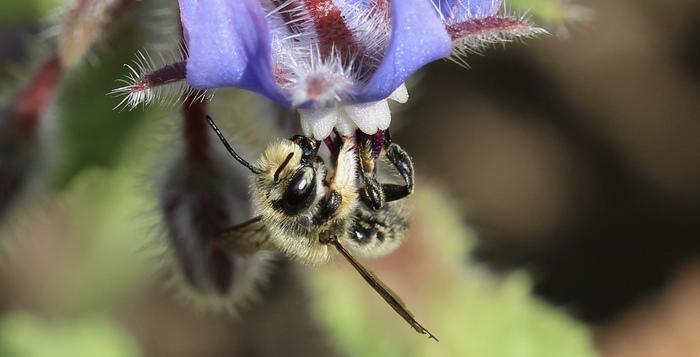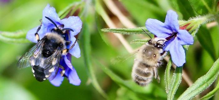 Au pied d’une haie où court et s’épanouit le Grémil bleu pourpre. Chaque printemps, en mars-avril, on y rencontre notamment deux abeilles sauvages inséparables. La Mélecte commune (Melecta albifrons) et l’Anthophore plumeuse (Anthophora plumides). Un duo mortifère.