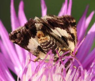 Réputée nocturne, la Funèbre apprécie aussi les lumineuses soirées printanières puis estivales. Butineuse assidue, la nuit comme le jour, elle apprécie notamment ici le nectar de la Centaurée blanchâtre.