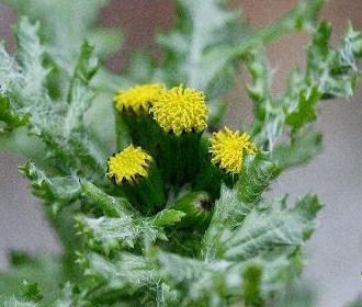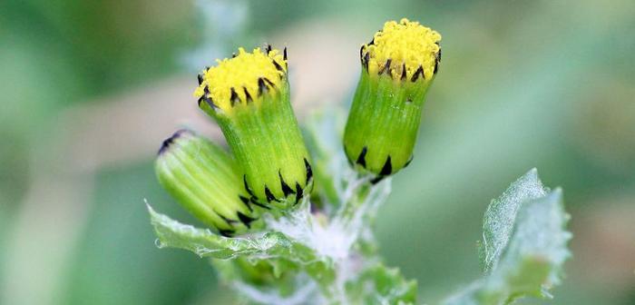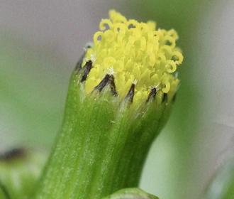 Certes, en hiver, il n'y a guère d'insectes pour le polliniser. Qu'importe. Nécessité faisant loi, le Séneçon commun se débrouille alors très bien tout seul. D'ailleurs, côté séduction, ses fleurs font le service minimum. Jaunes, tubulaires, sans pétales périphériques, elles sont réunies en petits fagots, engoncées dans une gaine de longues bractées vertes pointées de noir.