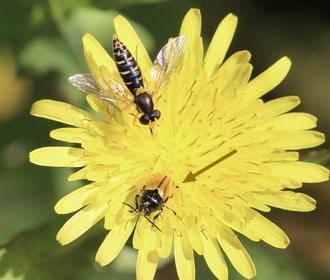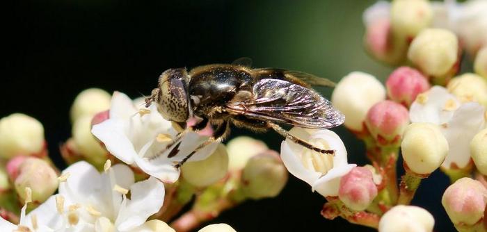 Sa petite taille (moins d’un centimètre) et sa dominante uniformément foncée en font un hôte très discret du jardin. Et pourtant, en plusieurs générations successives, l’Éristale bronzé (Eristalinus aeneus) y compte parmi les butineurs les plus actifs et assidus. De la fin février jusqu’en novembre.