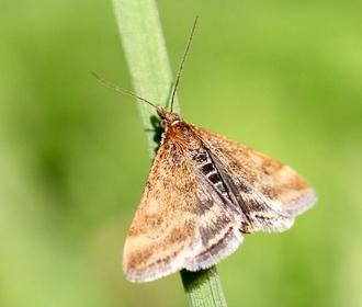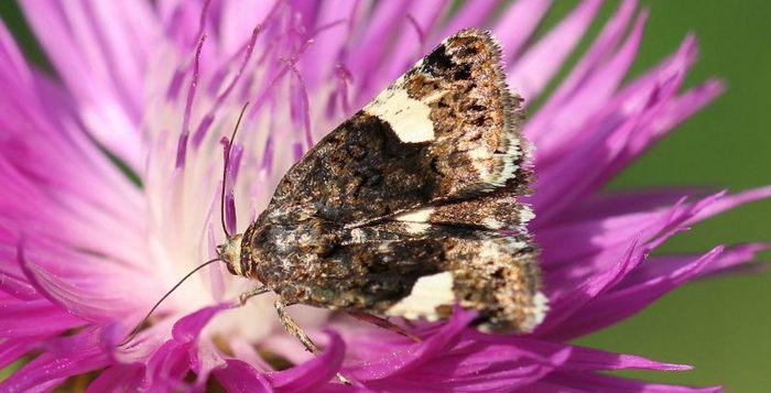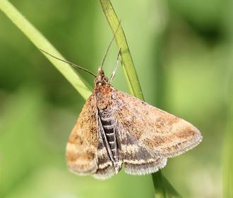 Revoilà la discrète silhouette triangulaire des pyrales. Mais, pas de panique, les chenilles de celle-ci ne s’attaquent ni au buis, ni aux légumes, ni au maïs, ni à la menthe…Comme son nom ne le suggère pas, la Pyrale des buissons (Pyrausta despicata) préfère confier sa progéniture aux prairies alentours. Avec une préférence pour le plantain, actuellement en fin de floraison.