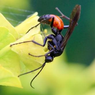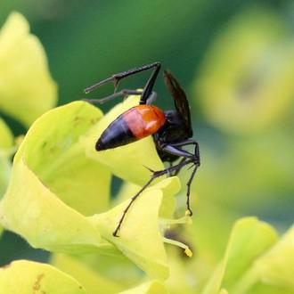 Svelte, noire, les ailes fumées, les premiers segments de l’abdomen rouge-orangé et de très longues pattes épineuses… Voilà une petite guêpe Pompile. Sa famille compte une centaine d’espèces en Europe, très difficiles à distinguer entre elles. Pompile sp. donc. Elle butine paisiblement ici les généreuses touffes d'euphorbe.