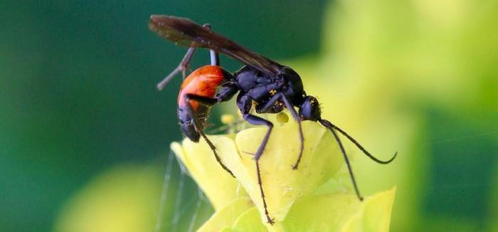 Mais les pompiles sont aussi de sacrées chasseuses. Les femelles du moins. Furetant en permanence, au jardin, dans les prairies alentour, les longues antennes toujours en mouvements, elles traquent inlassablement leurs proies. Pour nourrir leurs larves. Avec une cible privilégiée. Les araignées. Même les plus grosses tant les audacieuses n’ont peur de rien. Avec une seule stratégie : l’attaque et une piqure rapide. La victime est alors le plus souvent démembrée à coups de mandibules pour en faciliter le transport.