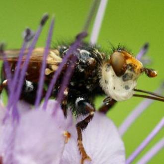 Étrange mouche. La Myope peinte (Myopa picta), ici sur la phacélie en fleurs, retient d’abord l’attention par ses joues blanches. Ses bajoues plutôt ! Pendantes, un peu flasques, elles évoquent une baudruche dégonflée. L’effet est accentué par une épaisse barbe en collier. Cette curieuse coquetterie est rehaussée de quelques taches noires. Comme le front jaune-orangé d’ailleurs.