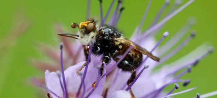 Les reflets sont ici moins éclatants qu’avec la Mouche verte aux mœurs parfois aussi peu ragoûtantes. Il faut en effet un peu de soleil pour faire ressortir le bleu. Métallique sur l’abdomen, grisé sur le thorax. Le tout hérissé d’épaisses soies noires.