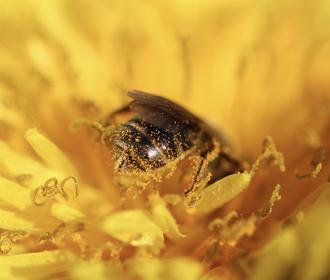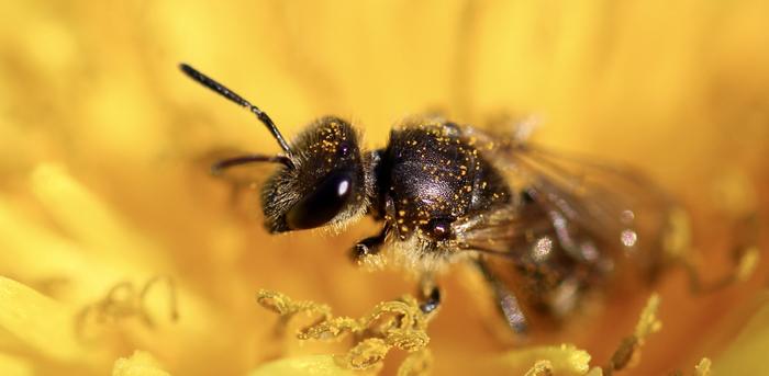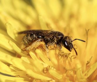 Imaginez un grain de riz noir, fin et allongé, parmi les fleurons jaunes d’un capitule de pissenlit. 6 mm tout au plus. Il faut s’approcher au plus près pour réaliser : il s’agit bien d’une (très) petite abeille sauvage !