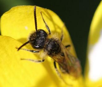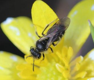 Une tout autre présence ! Loin de la chétive silhouette de Monsieur (9-11 mm), voici Madame Andrène à pattes jaunes (Andrena flavipes). Sur cette corolle de Ficaire fausse-renoncule, elle a le gabarit (12-13 mm) et un peu l'allure d'une abeille domestique. Mais c'est bien une solitaire qui s'apprête à creuser et aménager son nid.