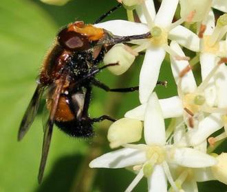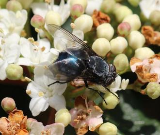 Elle figurerait sans doute en bonne place au palmarès des insectes les moins frileux ! Pas étonnant donc de voir la Mouche bleue (Calliphora vicina), début février, fréquenter assidûment le Laurier tin. Car, si elle est réputée familière des cadavres et des excréments, c’est surtout pour y installer sa progéniture. Sinon, comme tout butineur qui se respecte, elle apprécie le sucre du nectar.
