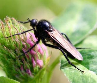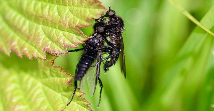 Non, ce n’est pas une parade nuptiale ! À les voir ainsi enlacés, on jurerait pourtant un couple de Mouches de saint Marc (Biblio marci) surpris dans ses préliminaires. Mais l’histoire est plus macabre que cela…