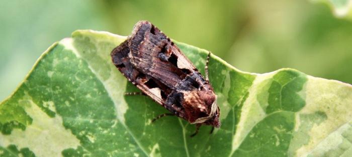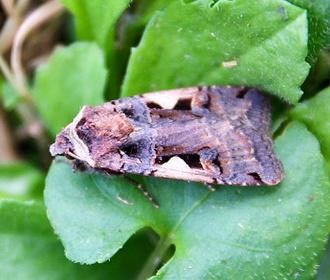Encore une noctuelle ! Une des plus communes en vérité. Le C-noir (Xestia c-nigrum) est d’autant plus répandu que ses chenilles ne sont pas difficiles… Les « vers gris tachetés » comme disent les Québécois se développent en effet autant sur les salades et les céleris que sur les orties, les rumex et le séneçon. Entre autres légumes ou plantes sauvages dont ils grignotent le feuillage. Et non pas les racines comme chez d’autres noctuelles.
