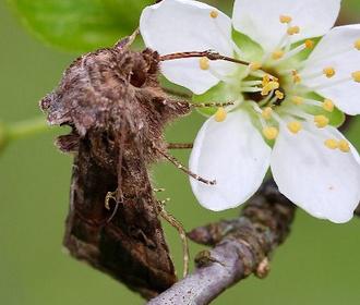 On a davantage l’habitude de la voir en plein été. Mais, en deux ou trois générations, la Noctuelle Gamma (Autographa gamma) est présente au jardin toute l’année. Ou presque. Avec son signe distinctif au centre des ailes antérieures : une marque blanche assimilée à une lettre grecque, lambda ou gamma selon le sens d’observation. À moins que ce ne soit l’image inversée d’un « y » !