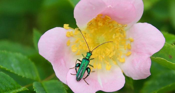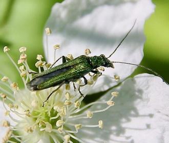 Inoffensif, l’Oedémère noble se laisse aisément approcher lorsqu’il broute les fleurs du jardin ou des haies. Moins vorace que la Cétoine dorée ou le drap mortuaire, il se contente des petits sacs de pollen. Noble et délicat !