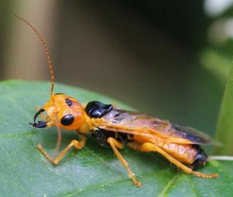 Voilà une cousine des tenthrèdes, toute parée de jaune orangé et de noir. La Pamphilie du bouleau (Pamphilius betulae) ne déroge pas à la règle de la grande famille des « mouches à scie ». Au printemps, les femelles incisent les jeunes pousses de leur plante-hôte pour y installer leur progéniture. Avec une allure de « fausse chenille », les larves s’y développeront aux dépens du feuillage. Celui du bouleau en l’occurrence. Sans oublier les peupliers ici dans le marais.