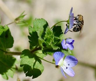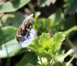 En attendant l’abondance du printemps, l’Éristale bronzé jette ici son dévolu sur des fleurs à sa mesure. Les petites corolles bleues de la Véronique de Perse. Entre deux virées sur le Laurier tin.