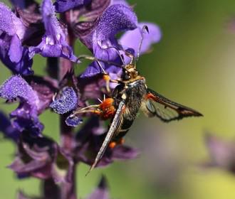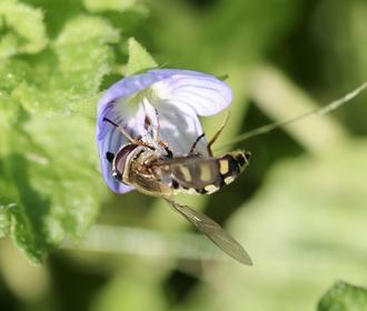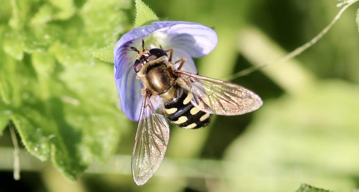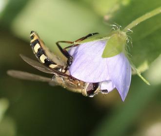 Ce n’est pas le seul point commun avec le Sicus. Hélas ! Car la Myope peinte, par ailleurs tranquille butineuse, est une redoutable parasite des abeilles sauvages. Les femelles vont pondre directement sur la fourrure de leurs cibles. Sitôt l’éclosion, les larves en percent la cuticule et commencent leur festin. Tout en gardant leur hôte vivant le plus longtemps possible. Le pupaison a lieu dans l’enveloppe vide. Pour une émergence au printemps suivant.