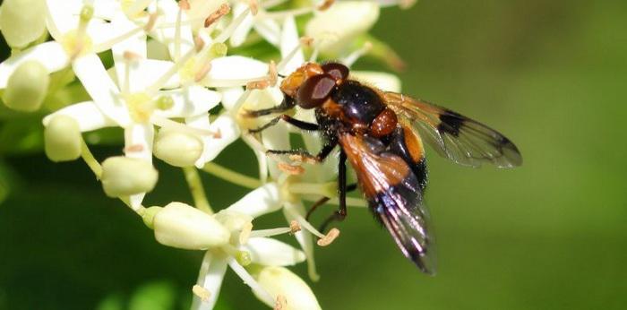 Deux gros yeux brun-rouge joints (un mâle donc, ici sur le Cornouiller en fleurs) dominant une face jaune-orangé. Y compris les courtes antennes. Des ailes transparentes fortement nervurées, teintées d’orange puis comme taguées de noir. Une double ligne rouge-brique sur les bordures du corselet, en écho au scutellum également brique. Et enfin, deux demi-lunes orangées à l’avant de l’abdomen noir. Avouons que tout cela ne manque pas d’harmonie.