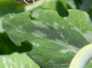 Feuilles marbrées, à zones vert pâle ou jaunâtres, en creux, entre les nervures. Cette maladie à virus est transmise par les pucerons.