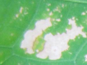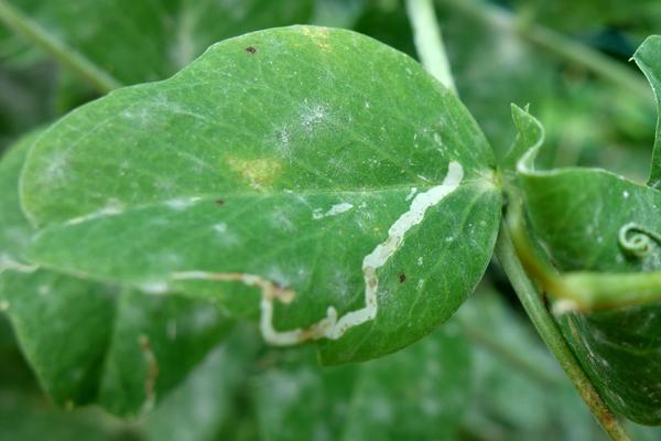 Des lignes sinueuses, argentées ou blanches apparaissent sur la surface supérieure des feuilles. Ce sont les galeries creusées par les larves d’une petite mouche de 2 mm de longueur.