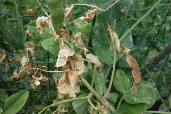 Les gousses sont déformées. Les feuilles et les gousses portent des taches brun clair, un peu en creux.
