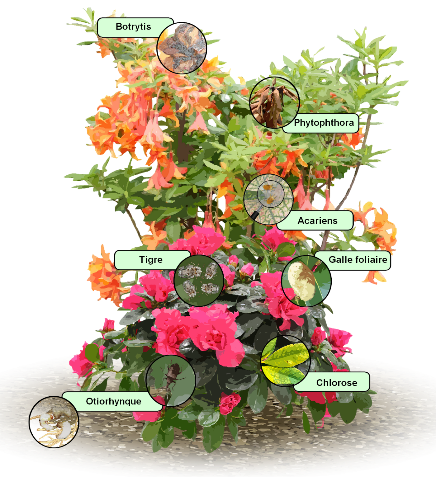 | Phytophthora cinnamomi. | Sans sécheresse l'azalée parait fané. Les feuilles en séchant finissent par s’enrouler, car le champignon colmate les vaisseaux où circule la sève. | Aucun traitement. Arracher la plante malade et ne pas en replanter au même endroit. |