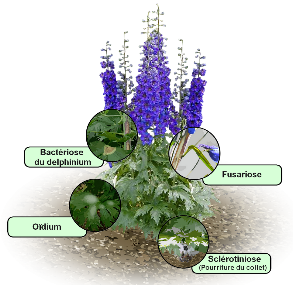 En massif , le delphinium peut être atteint par de nombreuses maladies ou parasites. Des traitements bio et de bonnes façons culturales en limitent les dégats.