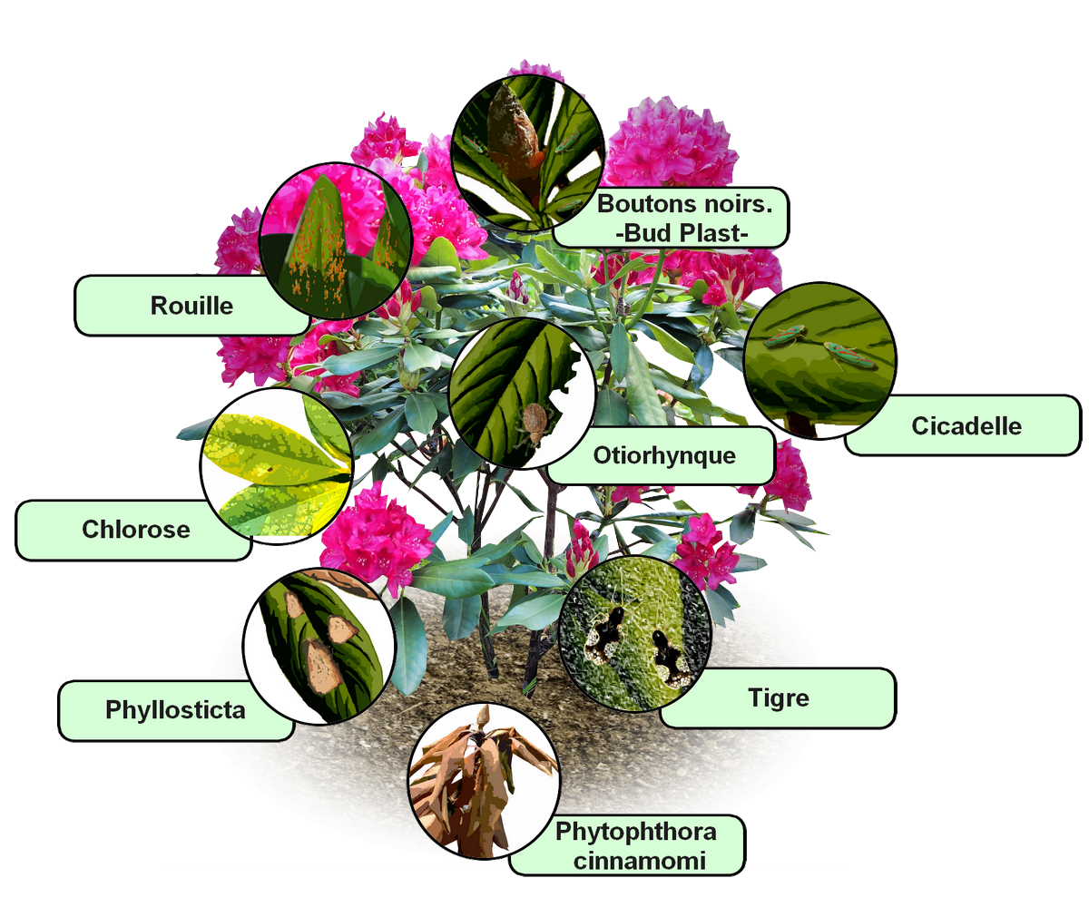 | Parasites ou Maladies du rodhodendron. | Symptômes. | Traitement bio, Prévention |
