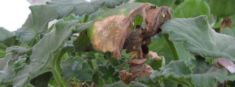 Des petits insectes piquent les feuilles, provoquant des plaies qui deviennent liégeuses qu’il ne faut pas confondre avec l’œdème du pélargonium.