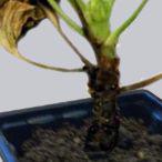 Boursouflures à la base des pousses ou des boutures présentant une zone noire qui s’étend à toute la plante. Mort rapide de la plante