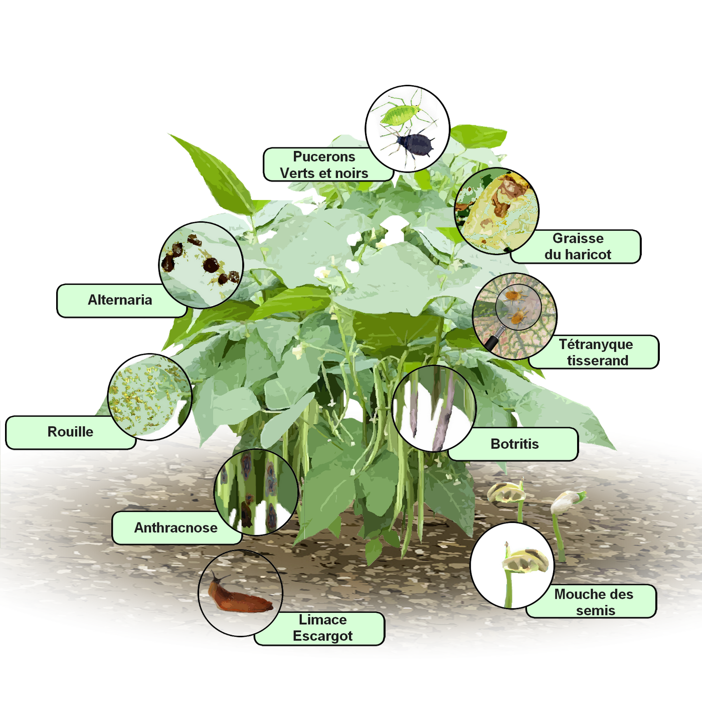Reconnaitre les parasites et maladies des haricots verts, à grains ou grimpants.