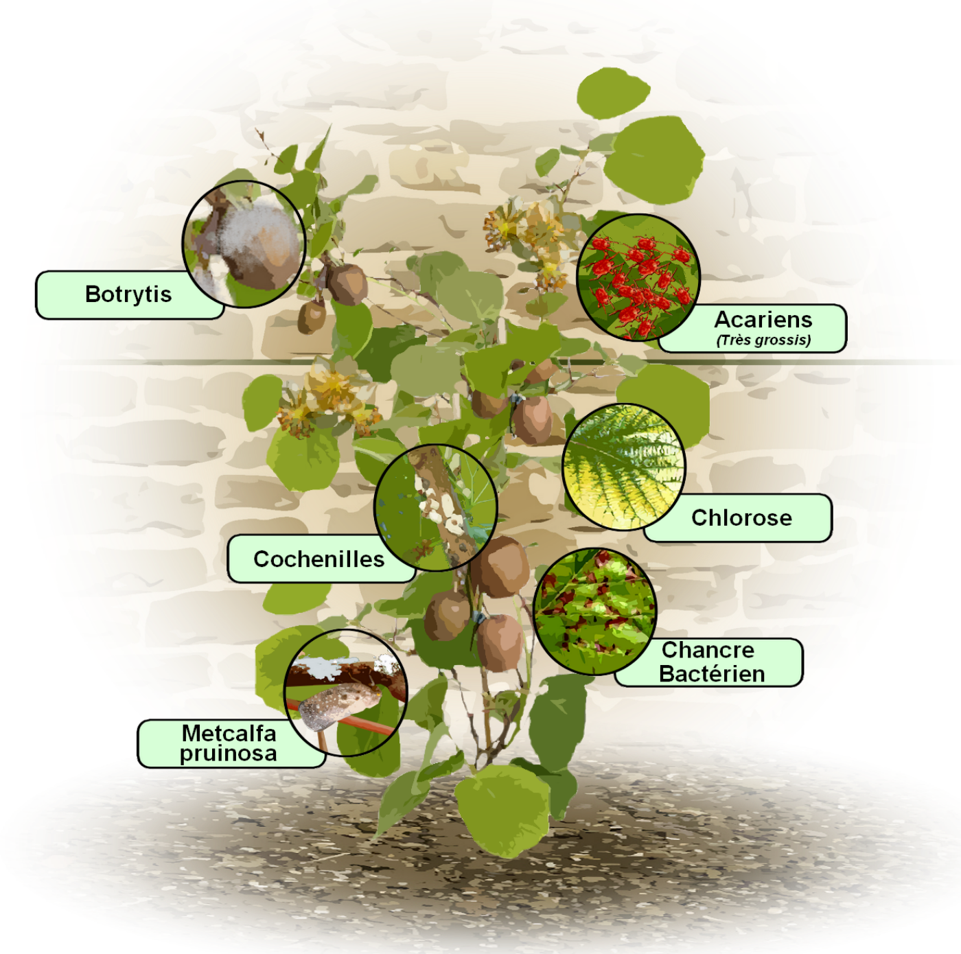 Les premiers symptômes sont des taches brunes sur les feuilles, les bourgeons brunissent et finalement après l’apparition d’exsudats sur les rameaux, le kiwi dépérit.