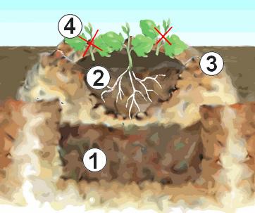1 - Vieux fumier. 2 - compost et terreau. 3 - cuvette d'arrosage. 4 - Eclaircissage des plants de patisson.