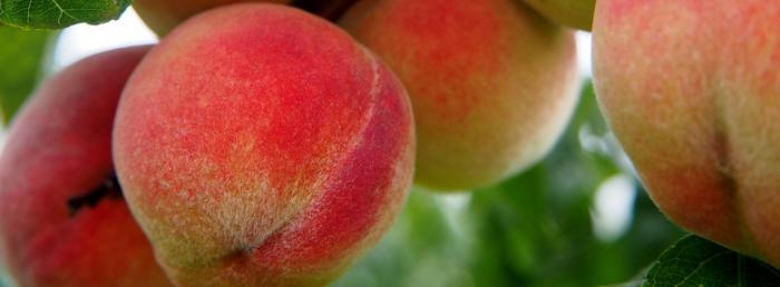 Sur un beau feuillage vert brillant, les pêches arrivent à maturité en aout.