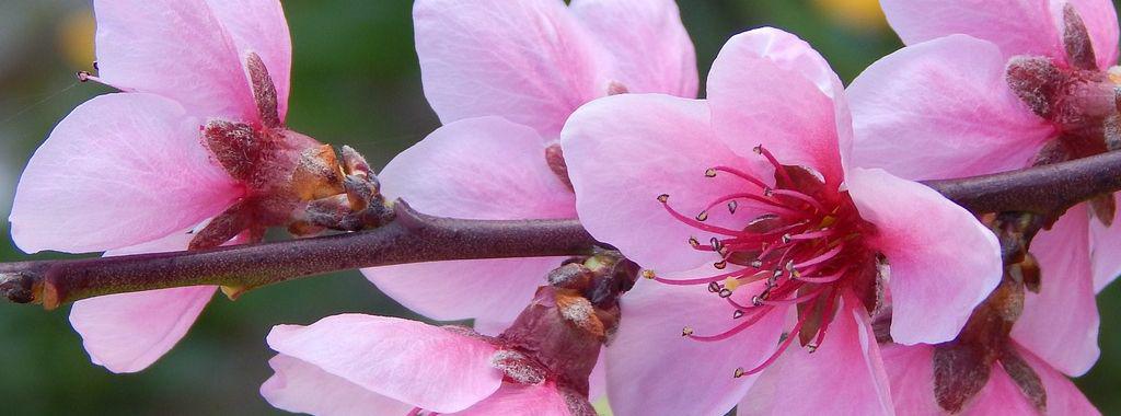 Ses fleurs roses apparaissent avant les feuilles à la fin de l’hiver ou début du printemps, voire en été pour les variétés plus tardives (pêche de Nancy). C’est un émerveillement au jardin au début du printemps, ce qui peut faire choisir aussi cet arbre lors de l’aménagement d’un jardin fruitier paysagé.