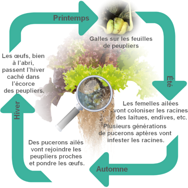 Des pucerons au cycle de vie complexe. Au printemps, les femelles qui ont passé l'hiver dans les anfractuosités de l'écorce des peupliers, piquent le pétiole des jeunes feuilles. Il en résulte d'étonnantes galles tire-bouchonnées où se développe une génération printanière qui, sitôt émergée, migre vers les jardins pour pondre à son tour sans retard. Par centaines d'individus, sa progéniture colonise alors tout l'été les racines des salades mais aussi des artichauts. À l'automne, nouvelle migration vers l'écorce des peupliers alentour pour une ponte avant les gelées. Et la boucle est bouclée !