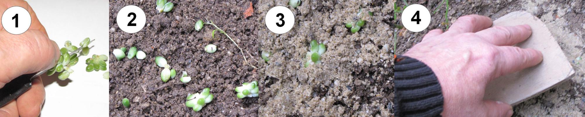 Il est possible aussi d’épandre des fragments de tiges, quelques feuilles sur une couche de terreau (1) et (2) et de les recouvrir d’un peu de sable (3) et tasser (4).