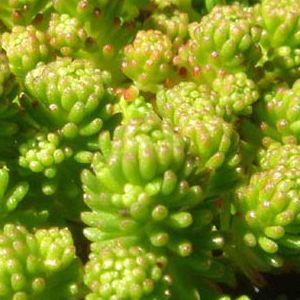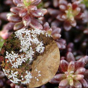 Sédum à tiges rougeâtres, feuilles persistantes en rosettes d’un beau vert pouvant devenir rouge. Très petites fleurs étoilées, blanches en été. Très rustique.