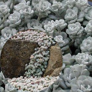 Multitude de petites rosettes de feuilles grasses, argentées. Petites fleurs jaunes au printemps.