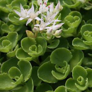 Sédum à feuilles semi-persistantes ovales vertes, crénelées. Les petites tiges portent des fleurs étoilées blanches en été.