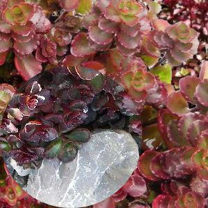 Sédum à petites feuilles persistantes aplaties, grasses, pourpres. Au printemps apparaissent de minuscules fleurs jaunes. Il est est très rustique -12/ -15°