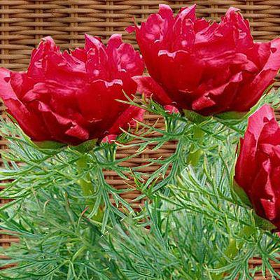 Pivoine tenuifolia ou « Goutte de sang » : peu présente dans les jardins, a un beau feuillage finement découpé. Ses fleurs sont simples, rouge sang.