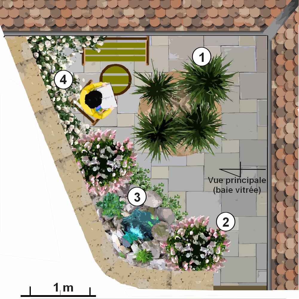 Le choix s’est donc porté pour ce jardin par l’emploi au cœur de l’espace d’une cordyline australis (1) à plusieurs troncs, très graphique et prenant peu d’espace au sol.