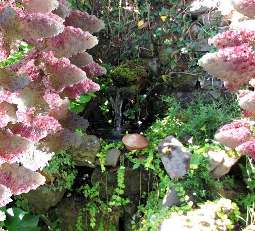 Face à la baie vitrée du séjour est installée une fontaine dans un éboulis de pierres(3) encadré par deux hortensias « vanille fraise »(2).