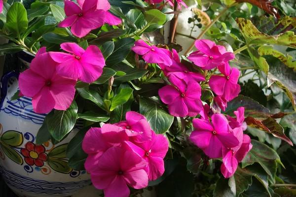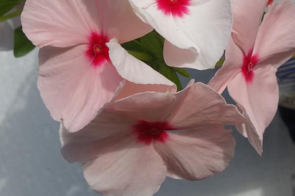 Cette pervenche de Madagascar pourtant plantée dans un petit contenant, résiste parfaitement malgré sa position « plein sud » où les températures se font extrêmes en milieu d'après-midi sur ce mur blanc.